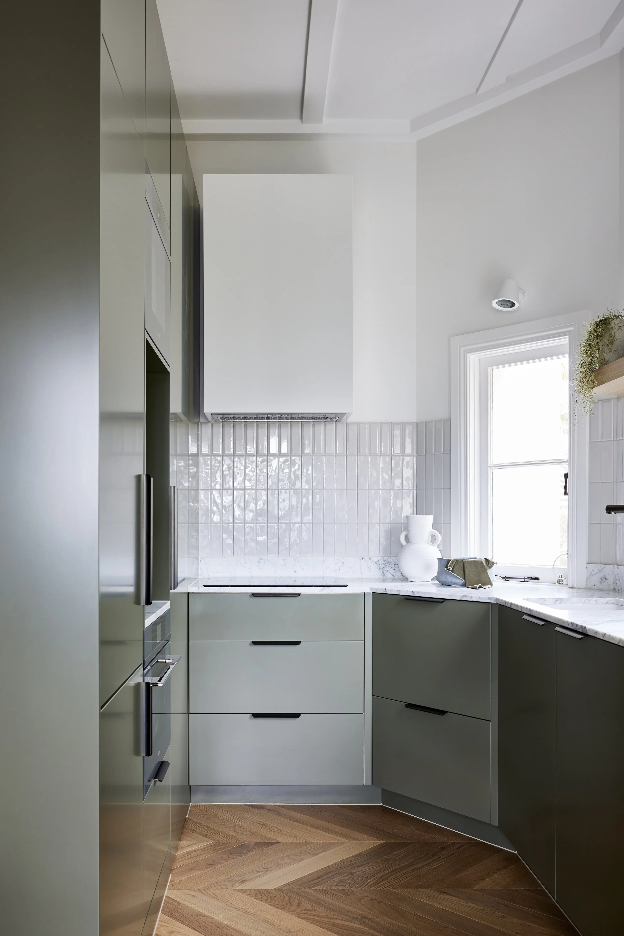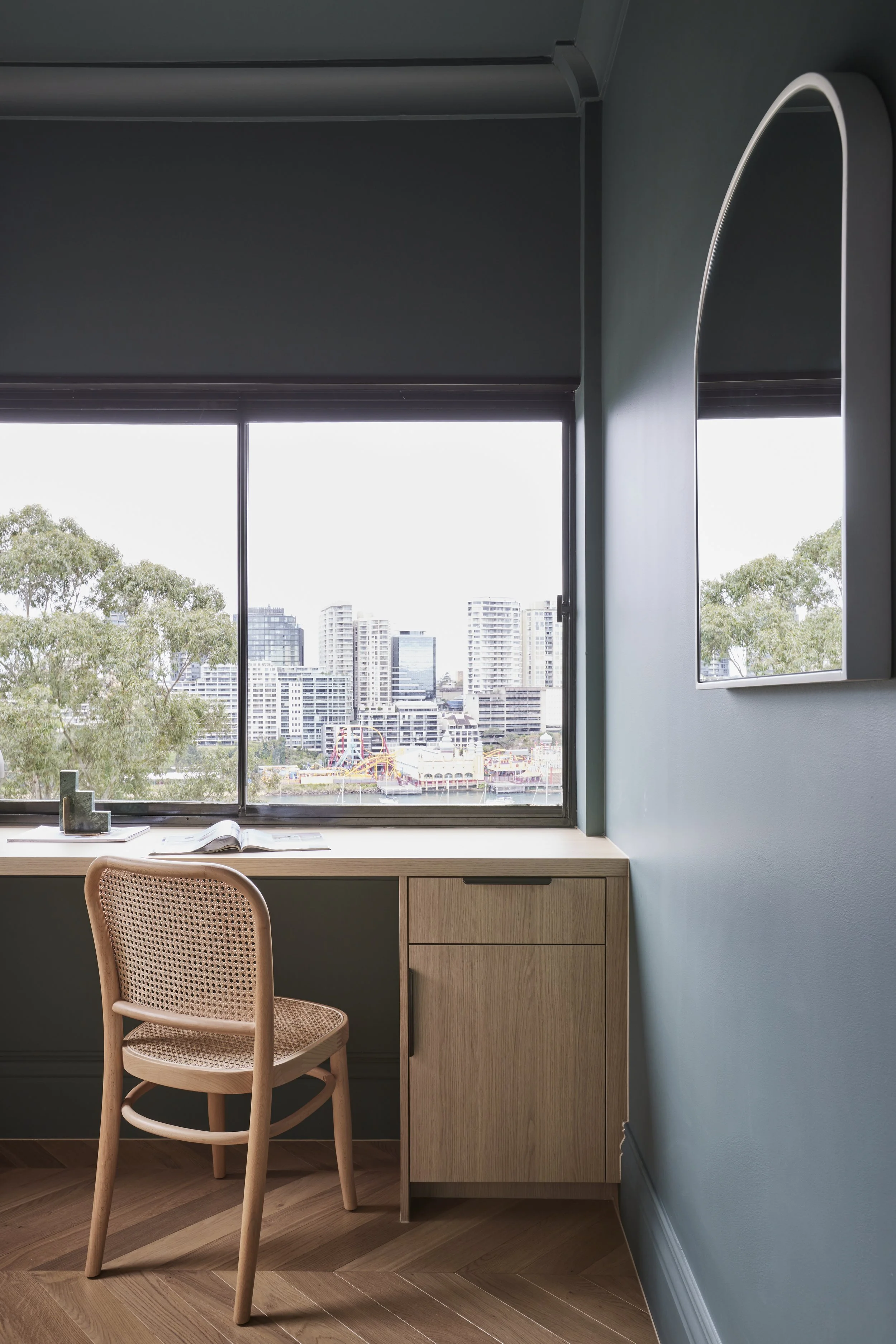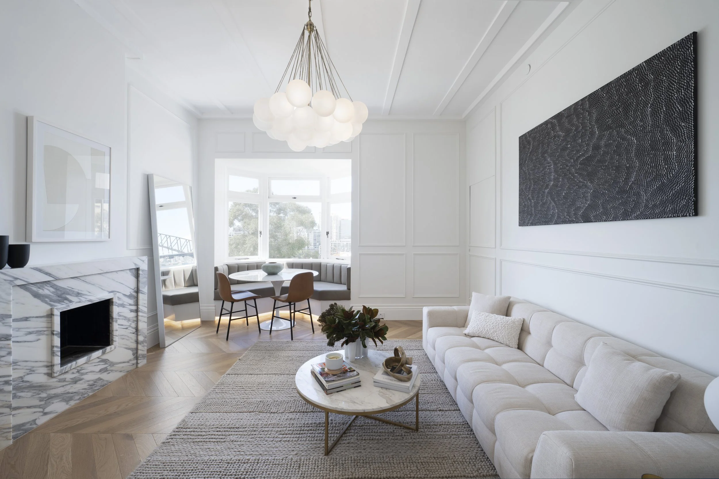 Upon walking through this apartment for the first time we were immediately struck by its incredible presence, despite its state of complete disrepair. The 3.4 metre-high coffered ceilings commanded attention, while the views of Sydney Harbour added a touch of magic. A true jewel, perched high amongst the treetops, that had all but lost its shine. Our vision was to infuse the apartment with old-world grandeur, restoring to it a splendour that had been neglected for decades. Chevron flooring, ornate pendants, and intricate moulding details were carefully incorporated to bring back the character that had been stripped over time. To pay tribute to the quintessential Australian landscape just outside the windows, we drew inspiration from the greens of nearby gum trees and the blues of Sydney Harbour below. The result was an awe-inspiring fusion—a grand European apartment with casual Australiana charm, perfectly in harmony with its building and enviable location. It is our hope that the renewed grandeur of this home would make its past custodians as proud as we are of the final outcome.